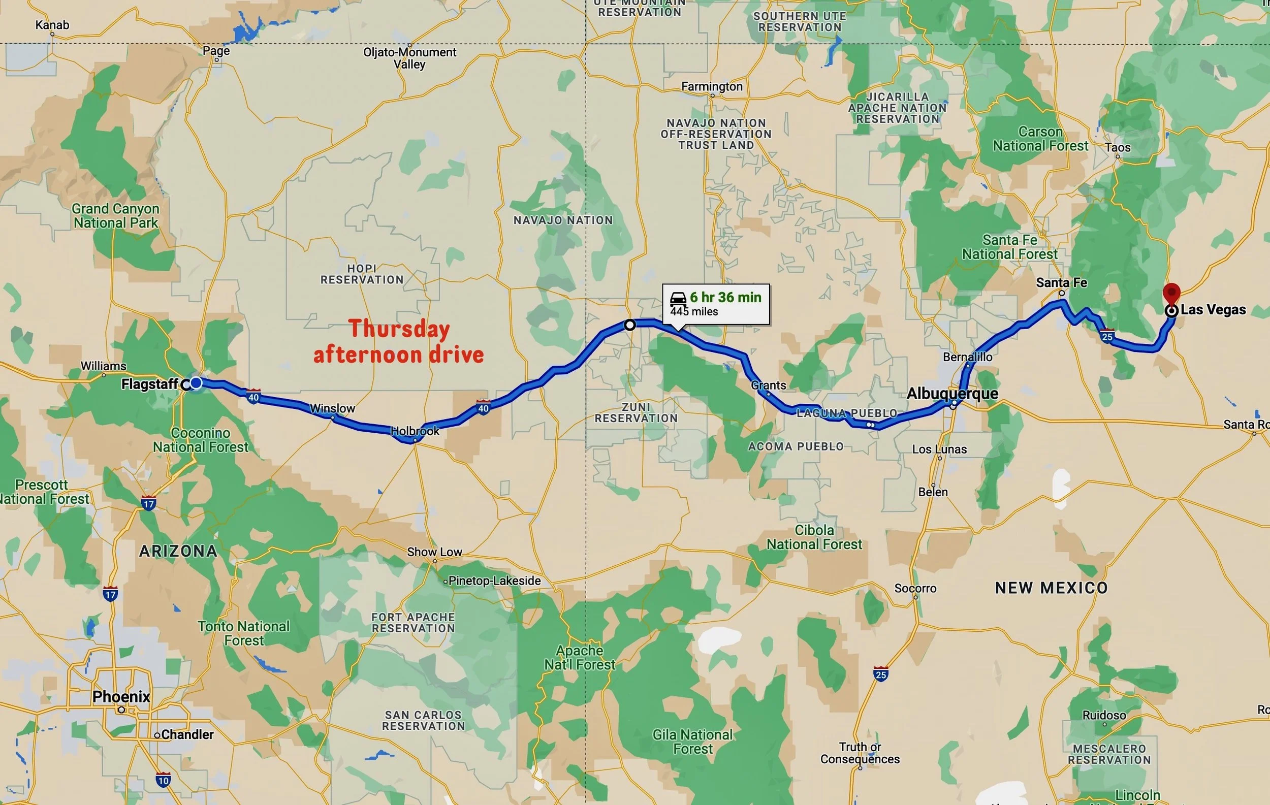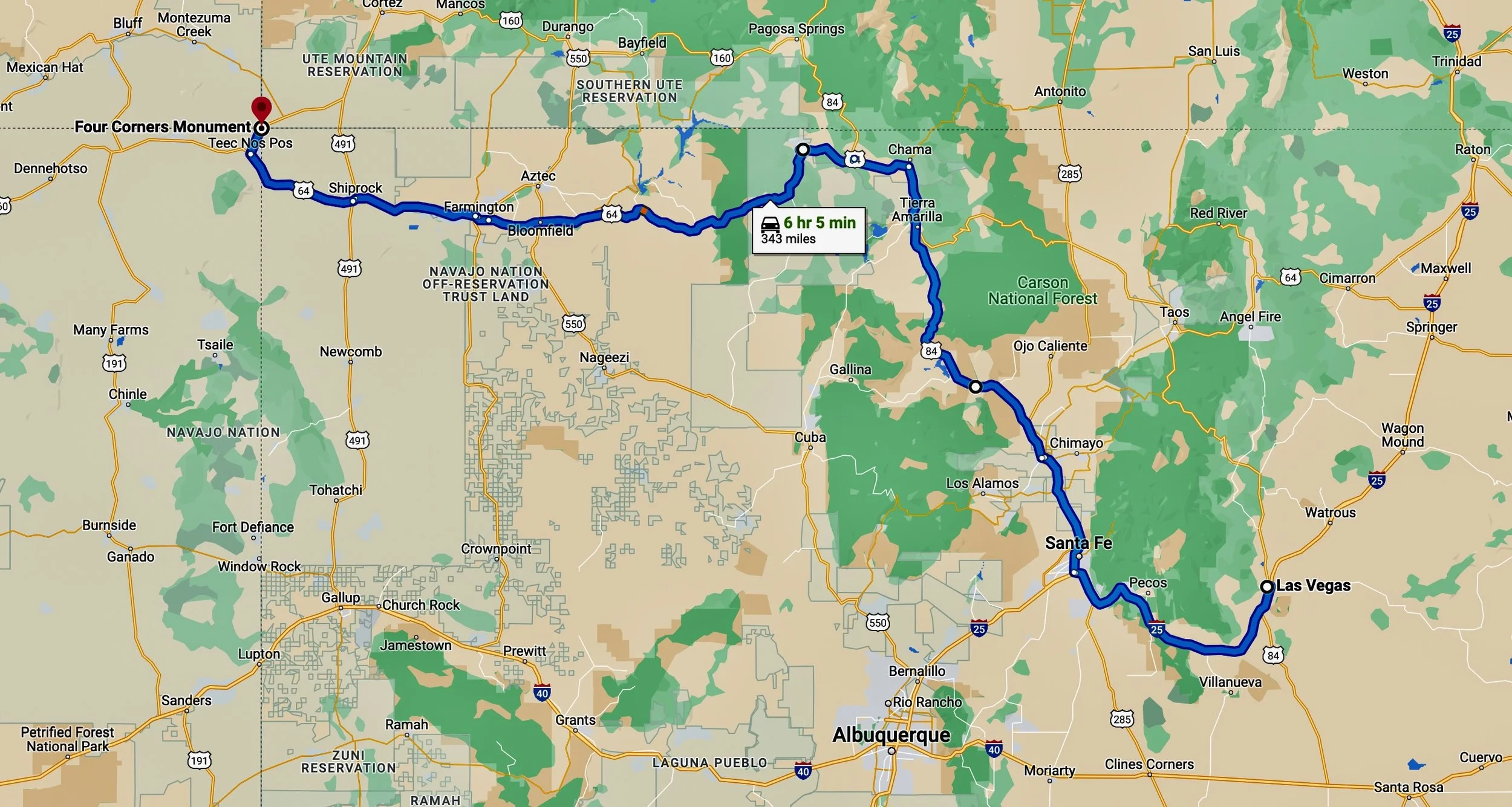 Flagstaff to Las Vegas, NM to Santa Fe to Los Alamos to Fort Union to Taos to Four Corners to Flagstaff